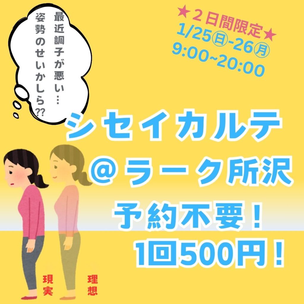 お待たせいたしました!「シセイカルテ」が1月25日(土)、26日(日)の2日間限定でラーク所沢にやってきます。「シセイカルテ」とは、姿勢を数枚撮影することで、からだの歪みを解析、分析!! 誰にでも理解しやすい形でトレーニングを提案し、効果を伝える姿勢分析システムです。前回測定された方も、初めての方もこの機会にぜひ!ラーク所沢受付前にてお待ちしております。